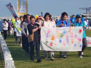 リレー・フォー・ライフの年間活動の締めくくりは、リレーイベントを開催します。会場ではチームの仲間とタスキをつなぎ、チームフラッグを掲げ歩きます。夜を越えて歩き、チームの仲間や参加者同士で朝をむかえる、夜通しのイベントを推奨しています。2024年度は、日本全国48か所・延べ47,643人が集いあったとの事です。