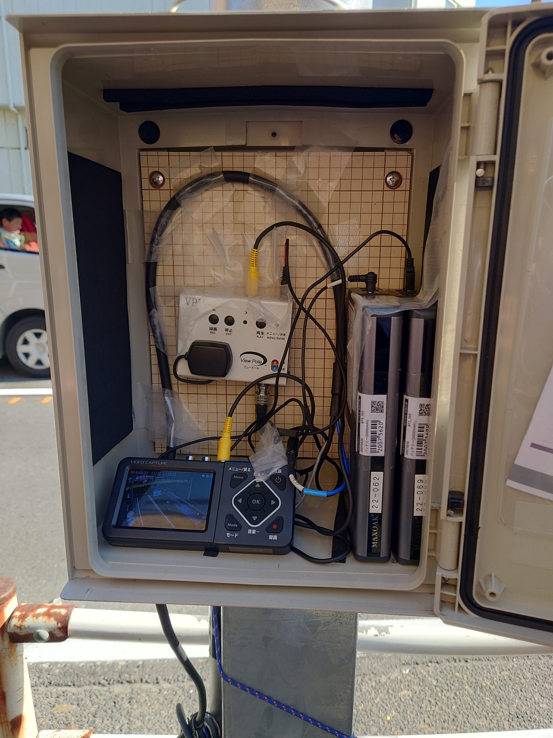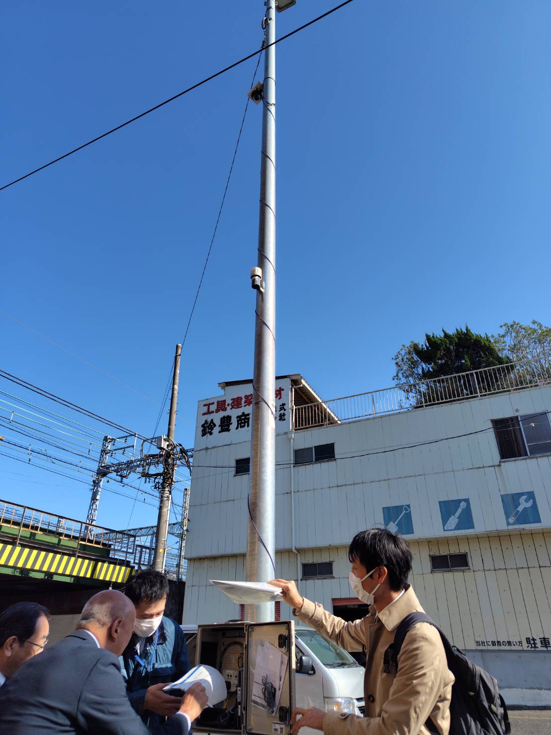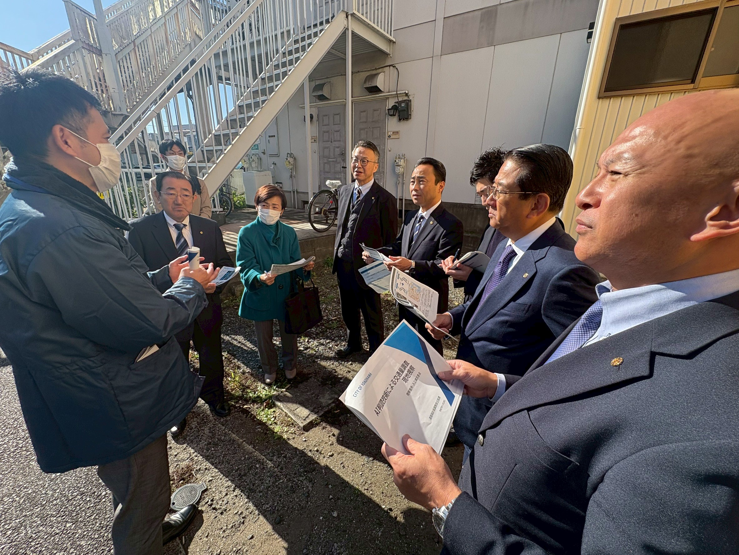 今回、神奈川区にある入江橋交差点における照明柱に設置した仮設カメラによる撮影による交通調査の模様を視察しました。これまでの実証実験では、LiDAR・カメラ映像の AI 解析、ドライブレコーダーから得られる GPS 走行データなどの ICT 技術を使用し、交差点における方向別・車種別(小型・大型)の交通量調査を行い、同時に撮影した映像データを人手による観測も行うことで、各技術の精度確認も行いました。また、車両速度や走行軌跡など交差点における危険要因や渋滞要因に加え、その他政策形成への展開を見据え、デジタル技術ならではの付加価値データの測定、分析を行いました。