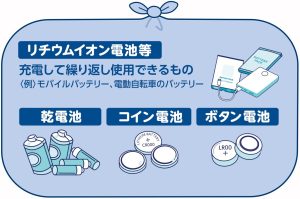 小型充電式電池(モバイルバッテリーや電動自転車のバッテリーなど、充電して繰り返し使用できるもの) ※リチウムイオン電池以外の、ニカド電池・ニッケル水素電池等も対象です。 バッテリーの取り外せない小型家電(手持ち扇風機、携帯ゲーム機など)は、同じ日に「別の袋」で出しください。