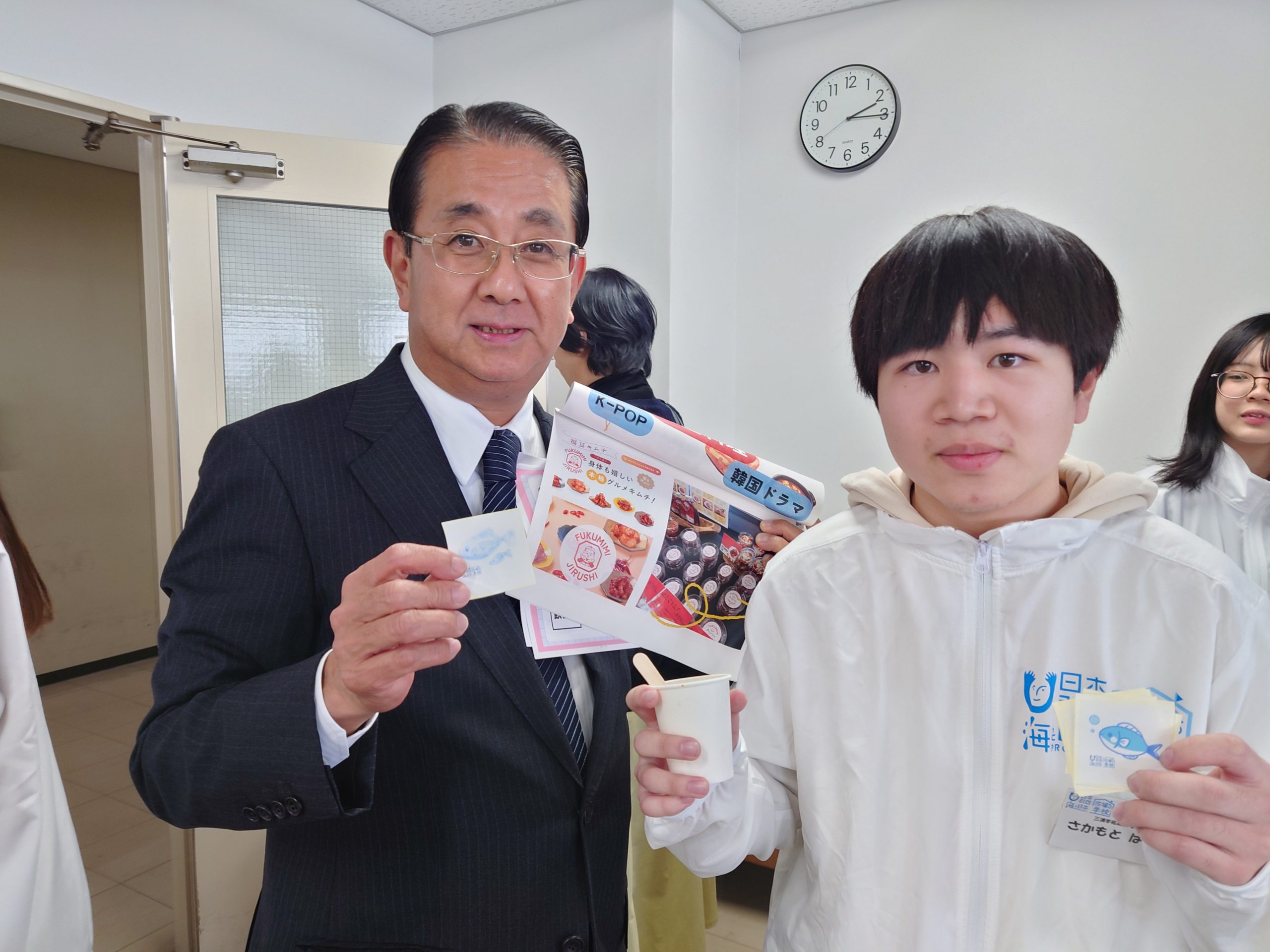 中央卸売市場の知名度向上を図ることで、市場全体の取引量や⼀般来客数アップに寄与する商品開発では、市場の海鮮を使用した〝キムチ〟その名も〝うみ福〟!!大変美味しくいただきました。素晴らしい高校生達の取り組みには、感動と共に大切なメッセージを送ってくれた気がします。貴重な時間となりました。