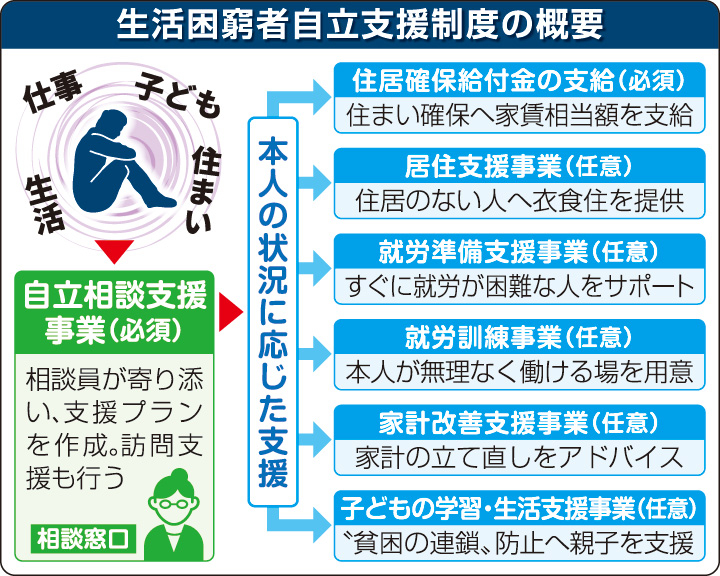 【家計改善支援】: 家計の立て直しに関する相談支援も行っています。【子どもの学習支援】: 将来の困窮を防ぐため、生活保護受給世帯の子どもも対象とした学習支援などを盛り込みました。【関係機関との連携】: 制度開始当初から、自治体の関係部署やNPOなどとの情報共有・連携体制の構築を重視しており、「声なきSOS」を受け止めることを掲げています。